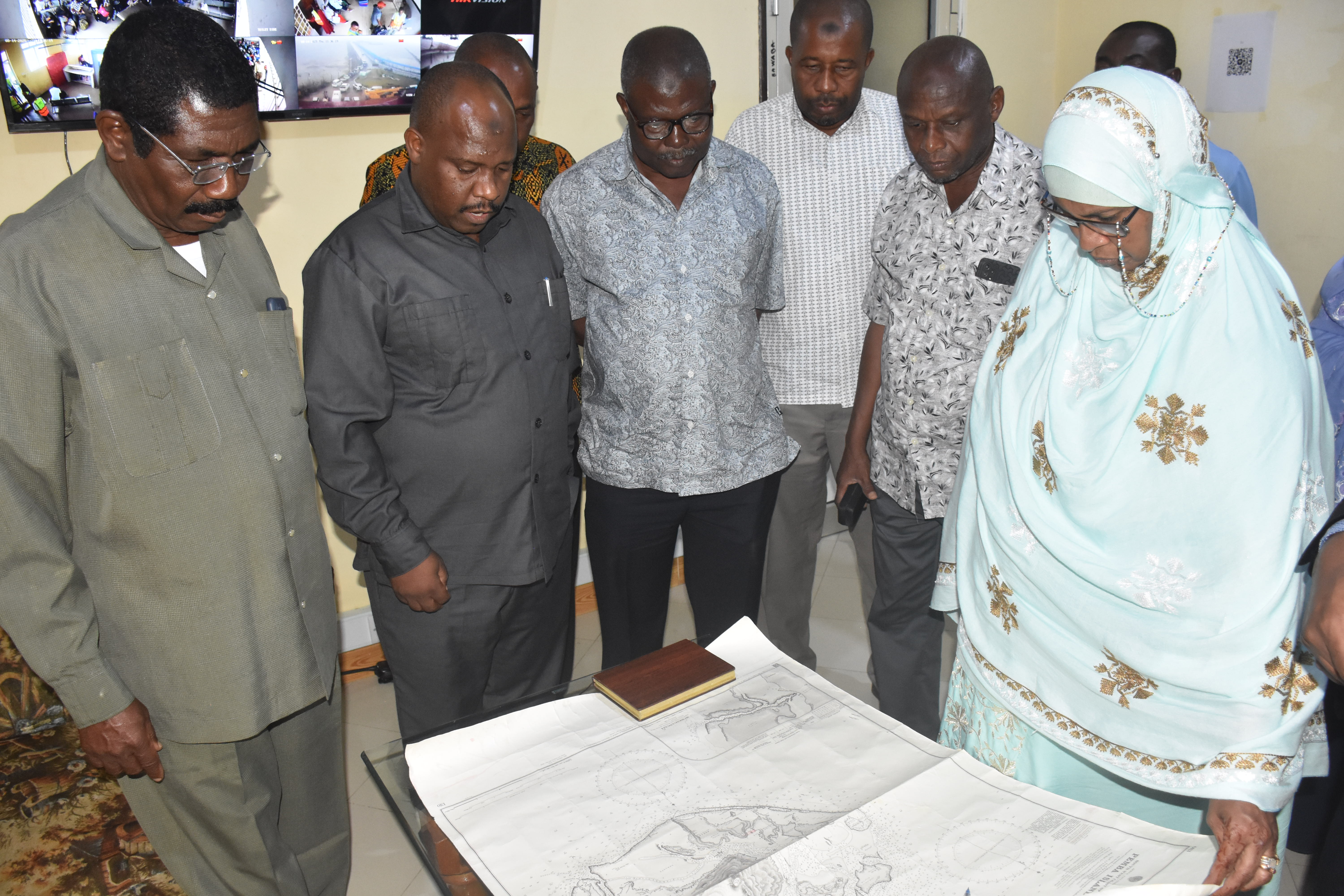 Wajumbe wa Bodi wakiongozwa na Mwenyekiti Ndugu Sheha Makame Mussa wakipata maelekezo kutoka kwa Mkurugenzi wa shirika la Bandari Pemba